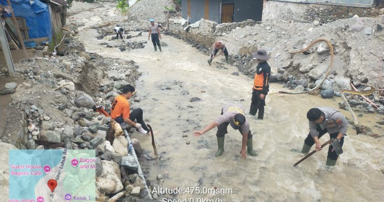 Upaya penanggulangan bencana juga dilakukan melalui kegiatan gotong royong bersama personel Polres Agam dan para relawan di wilayah Batang Muaro Pisang.