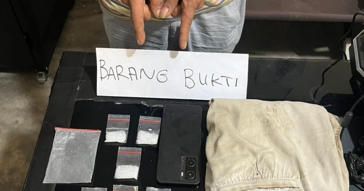 Dari tangan tersangka, petugas mengamankan barang bukti berupa tiga paket diduga sabu, tiga plastik klip bening, satu plastik klip besar, satu celana pendek warna krem, serta satu unit smartphone warna hitam.